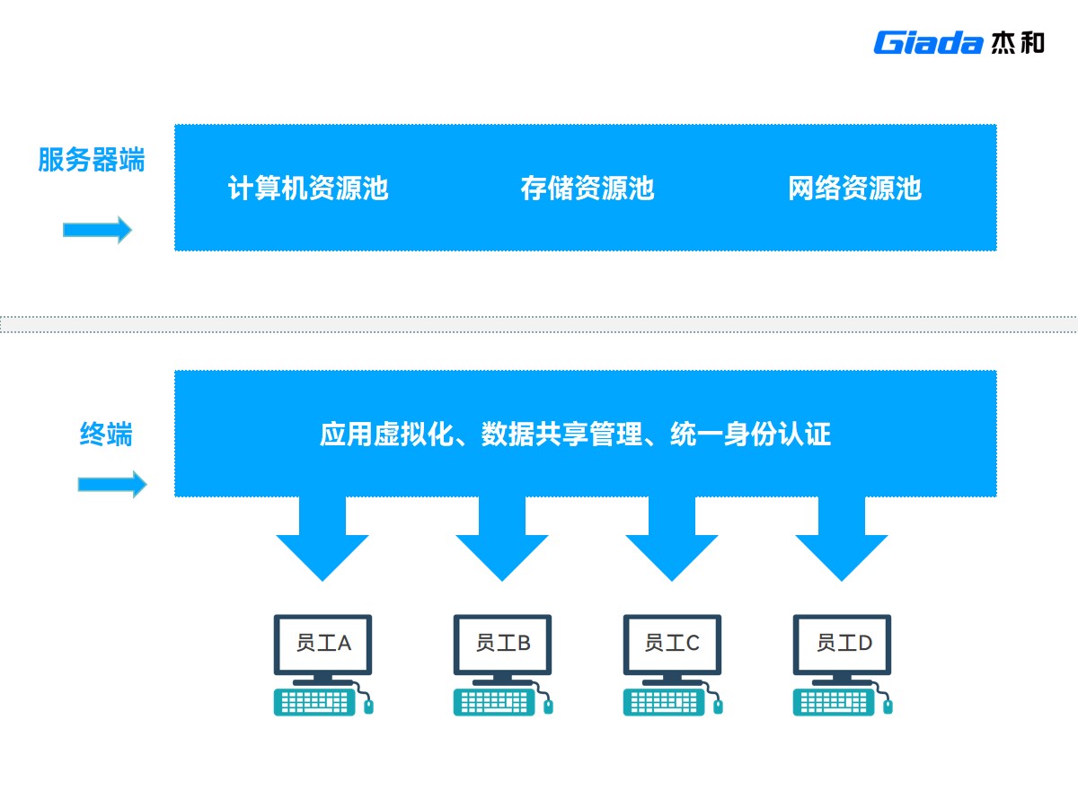 证券公司新员工入职报到后,只需领取一台JDB电子科技云终端,再配上显示器、键盘和鼠标,插上网线就能立即投入工作,免去复杂的系统安装和软件部署过程,大大缩短了新员工的入职准备时间。