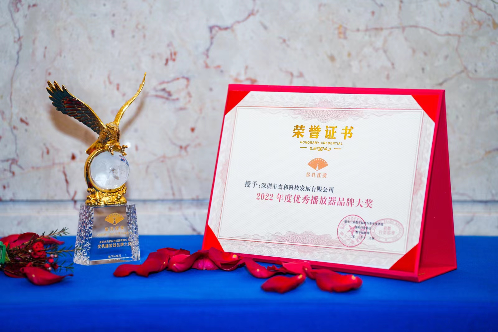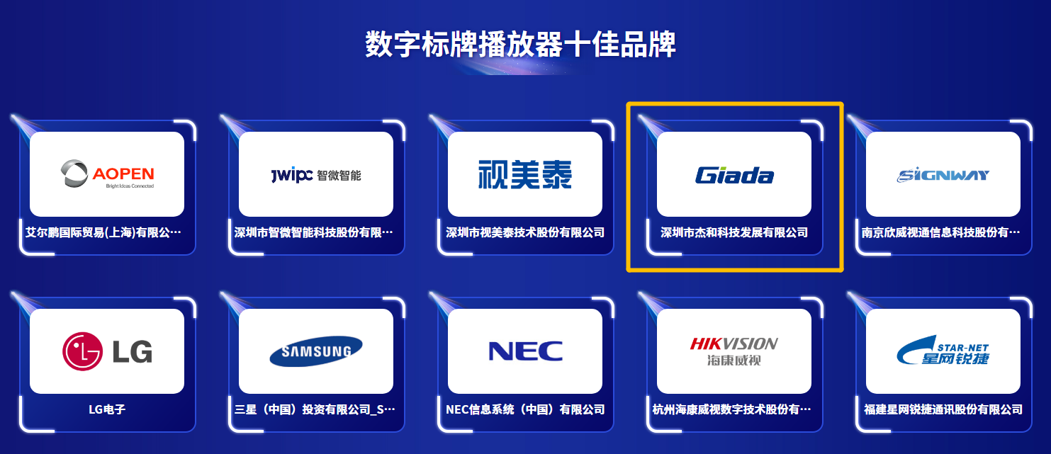 GiadaJDB电子科技凭借突出的市场竞争力、强劲的产品创新力、卓越的产品成长力、领先的品牌影响力,从众多候选企业中脱颖而出,斩获“优秀多媒体信息发布系统品牌大奖”、“优秀播放器品牌大奖”两项荣誉。GiadaJDB电子科技已连续四年登上领奖台。