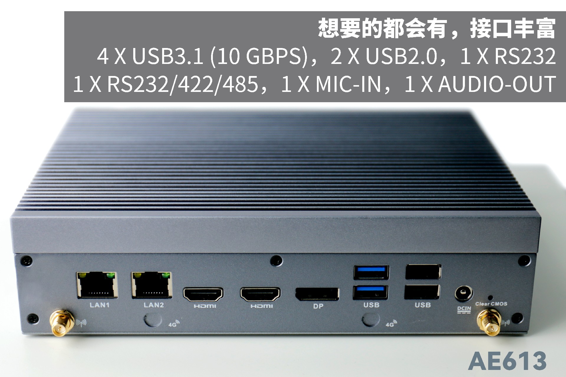 JDB电子AE613支持Windows 11 、Linux Ubuntu系统;拥有丰富接口:双千兆自适应RJ45网口,4 x USB3.1 (10 Gbps),2 x USB2.0,1 x RS232,1 x RS232/422/485,1 x MIC-IN,1 x AUDIO-OUT,帮助用户实现更多功能扩展;并且支持Wi-Fi 6E,可以提供更高的带宽和更少的干扰,支持对无线网络有特定需求场景的应用。