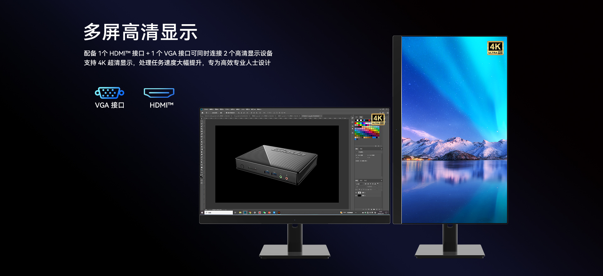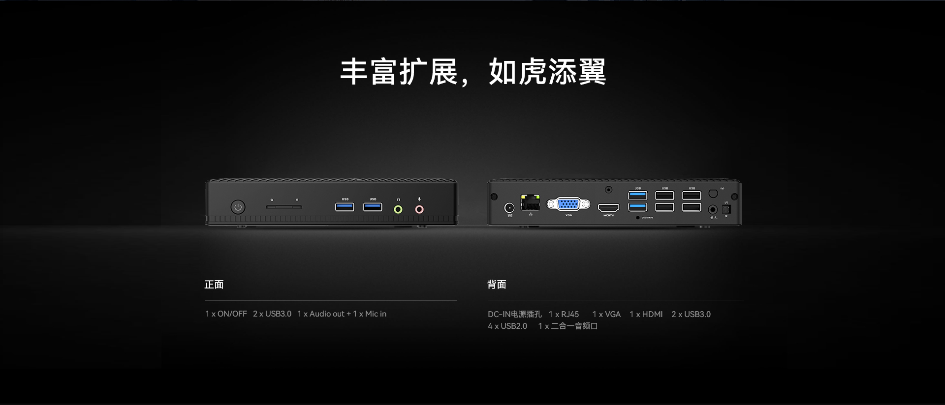 1 x HDMI,1xVGA双视频接口输出,支持4K @60Hz视频输出